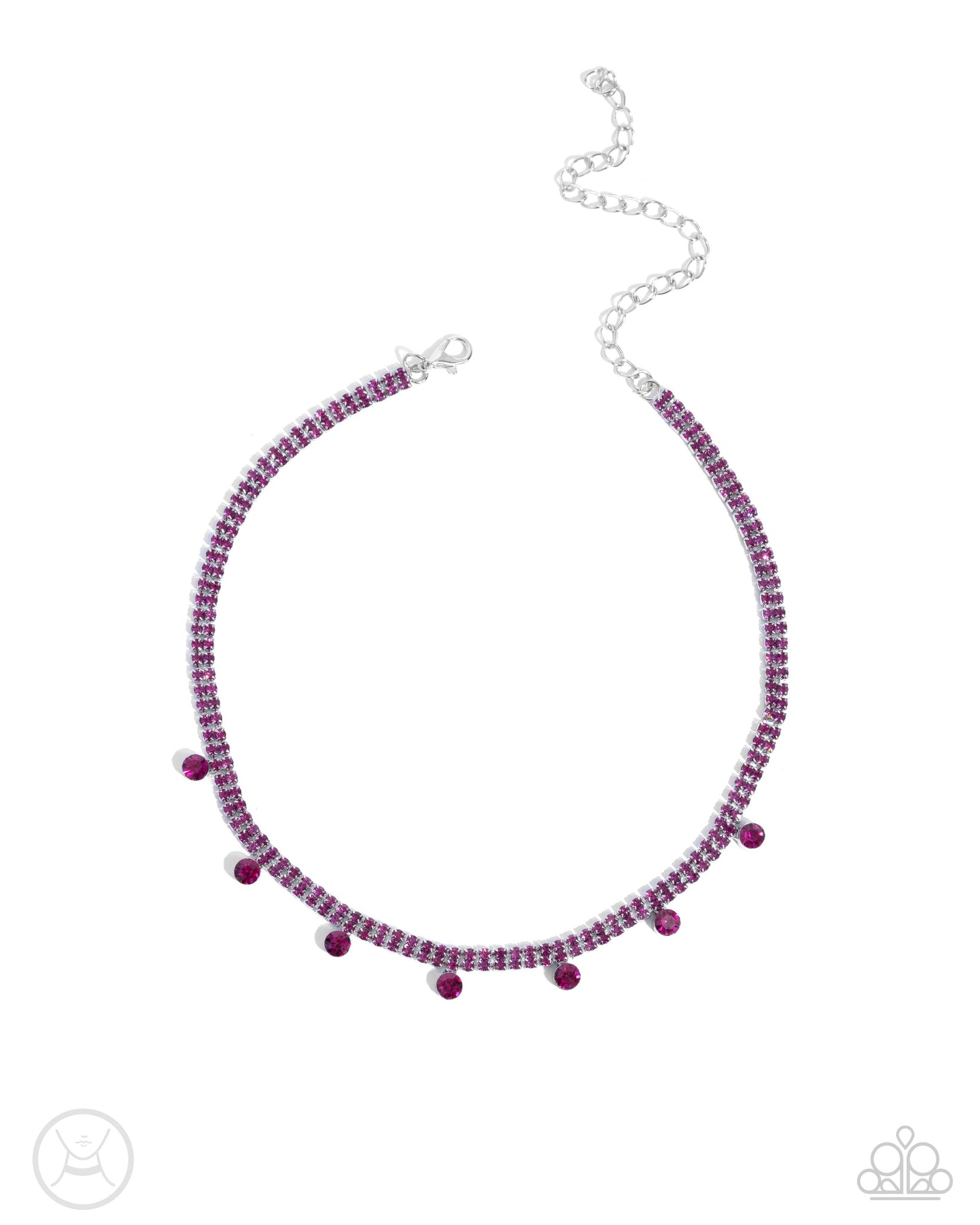Featuring sleek silver square fittings, blinding rows of dainty fuchsia rhinestones coalesce around the collar, resulting in a striking shimmer. Larger solitaire fuchsia rhinestones in round silver fittings sporadically dot across the lowermost sparkly row for additional color and detail. Features an adjustable clasp closure.