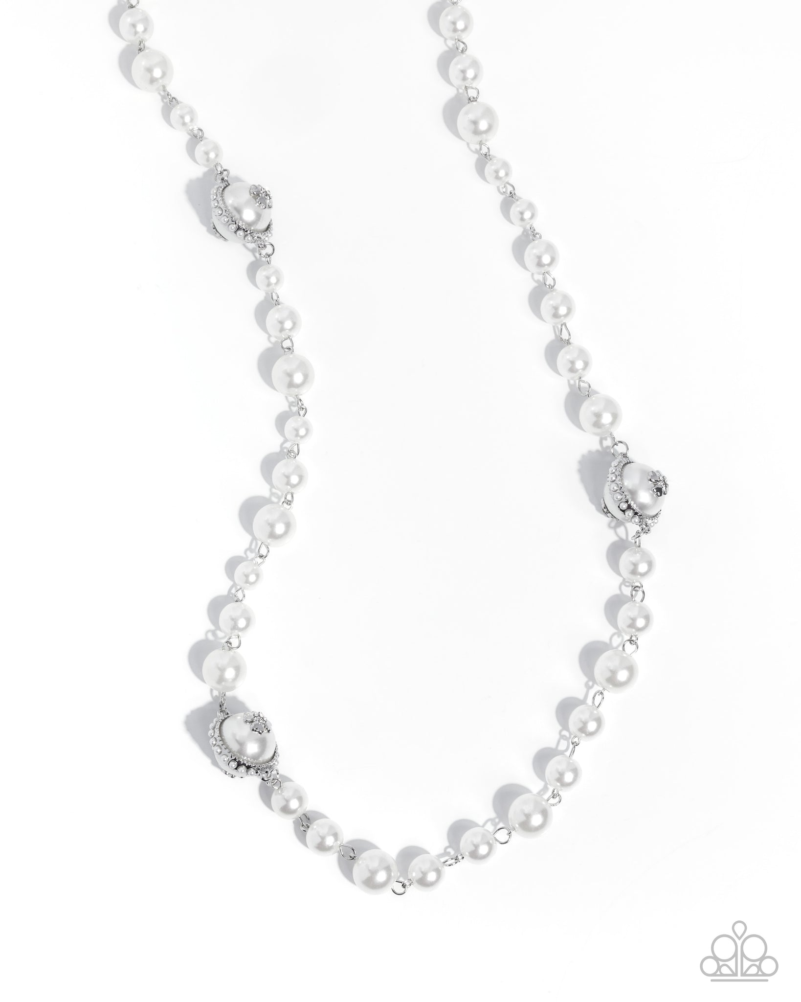 Infused along a classic silver chain, a collection of highly polished, smooth white pearls in varying sizes, some featuring floral centerpieces, additional pearly embellishments, and doubled spheres, extends below the chest for a luminous, ladylike display. Features an adjustable clasp closure.