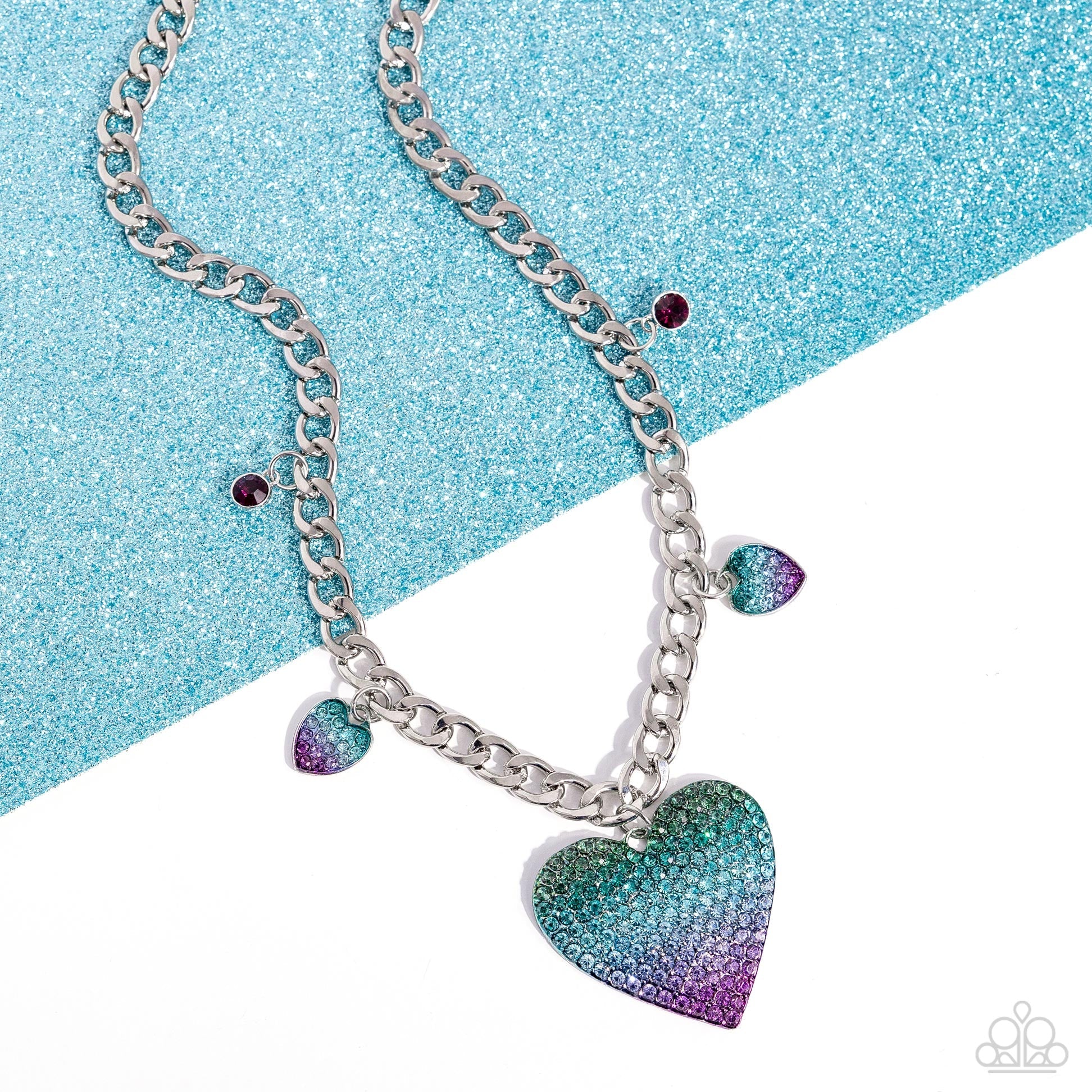 Featuring an ombré effect, dainty silver hearts encrusted with a blinding display of green to turquoise to purple rhinestones and solitaire purple gems connect along a classic silver curb chain. An oversized silver heart pendant featuring the same ombré rhinestones cascades from the bottom of the display for a romantically refined finish. Features an adjustable clasp closure.
