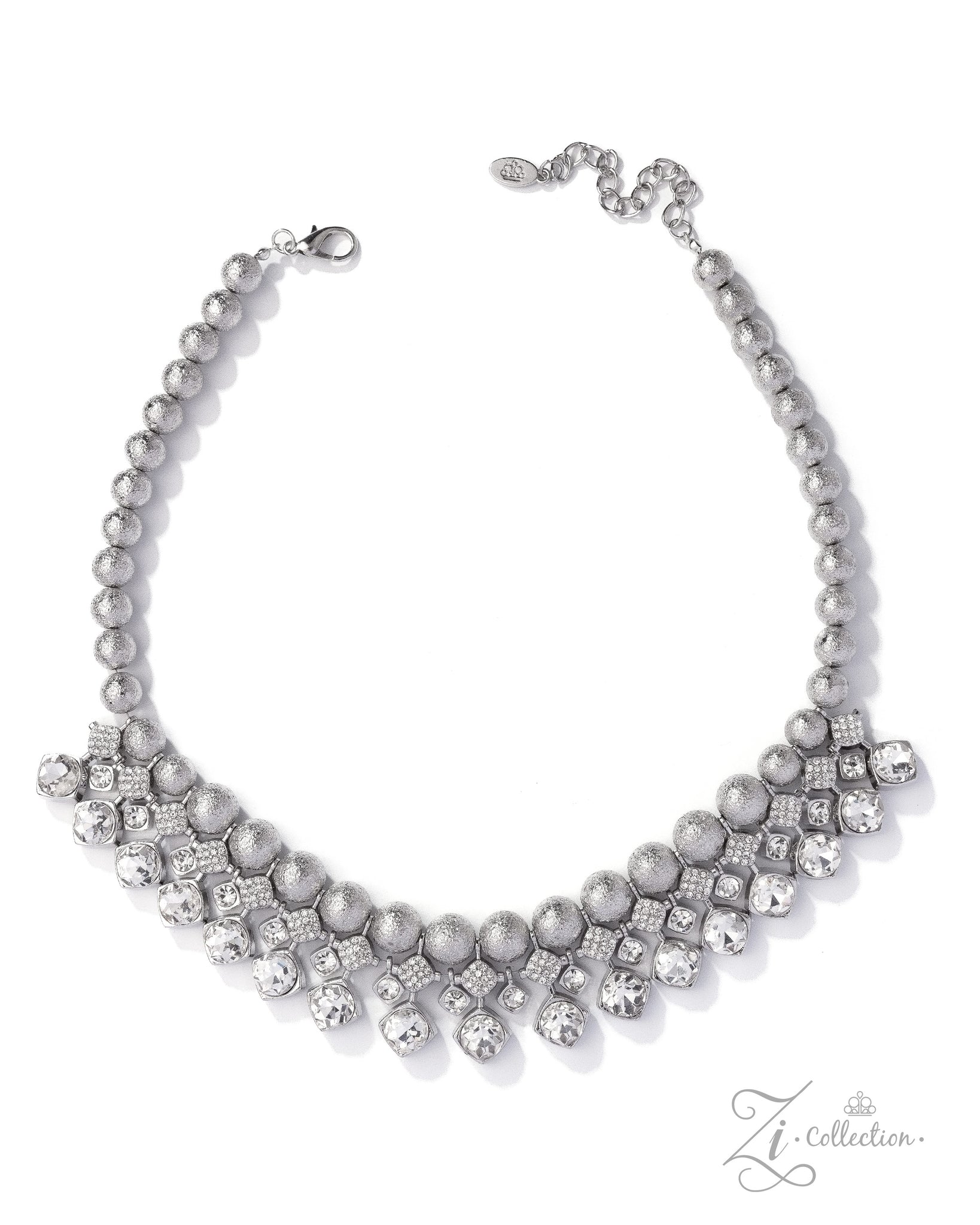 Infused along an invisible wire, a refined strand of subtly textured silver spheres gradually increases in size as they radiate toward the center of the chest in a sleek display of modern sophistication. Below, layers of slender silver wires erupt into a glittering cascade of brilliance—staggered diamond-shaped frames dusted in white rhinestones give way to oversized white gems that drip with unapologetic drama. Intermixed with delicate solitaire gems in minimalist silver frames, each luminous element links across the neckline, building into a sensational statement piece that demands a double-take. Features an adjustable clasp closure.
