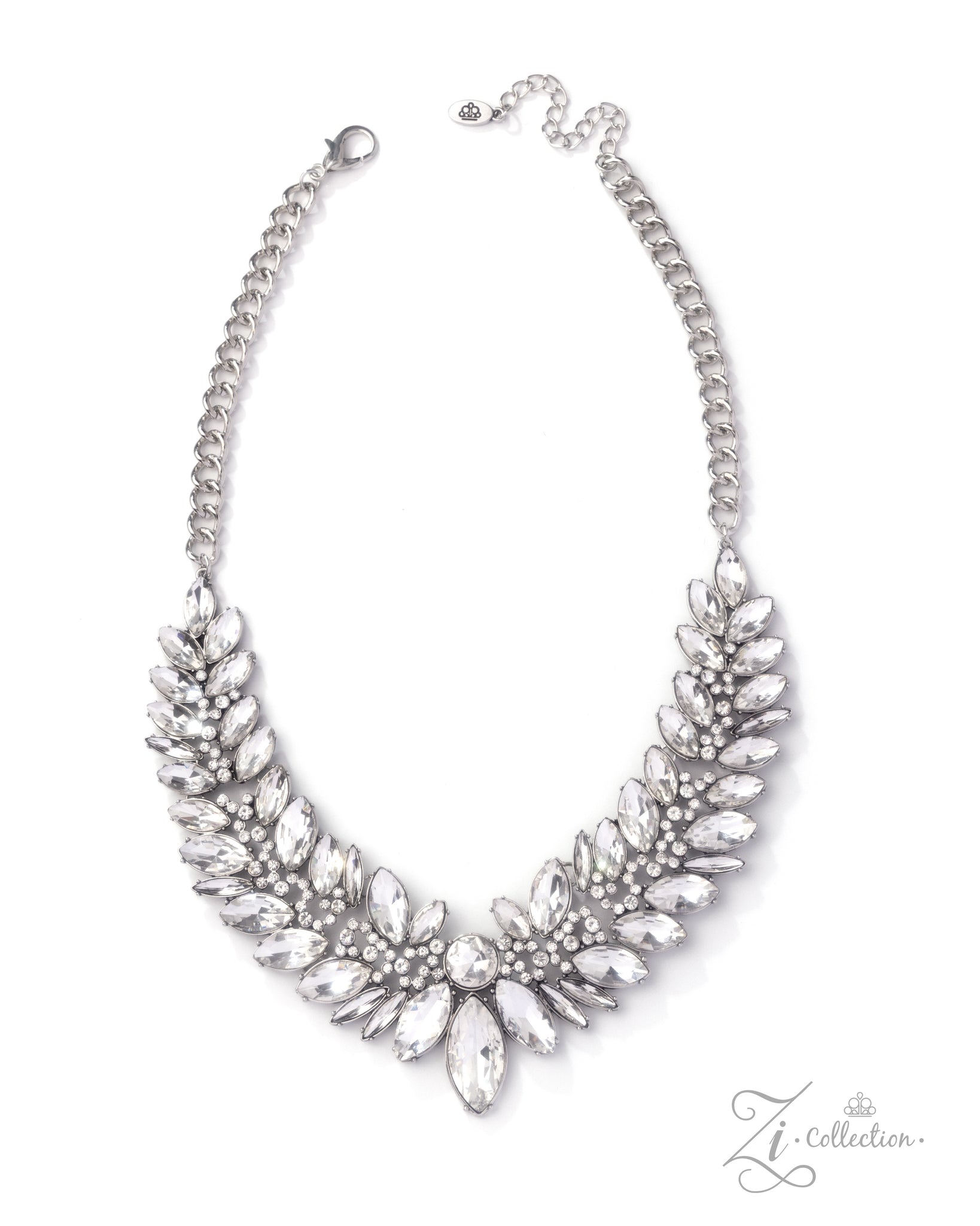 An icy collection of oversized round and marquise-cut white gems daringly fan out from the collar, coalescing into intense interconnected frames. The dauntless display of dazzle locks in place around staggered clusters of dainty white rhinestones, creating a stunning sparkle. Features an adjustable clasp closure.