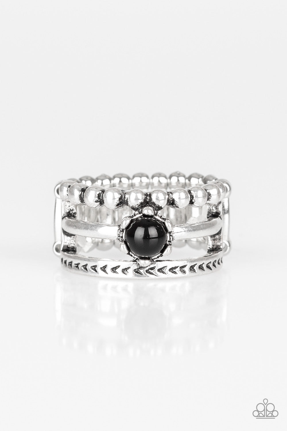 A trio of studded, smooth, and tribal stamped silver bands layer across the finger, coalescing into an airy frame. A shiny black bead is pressed into the center of the shimmery layers for a perfect pop of color. Features a stretchy band for a flexible fit.