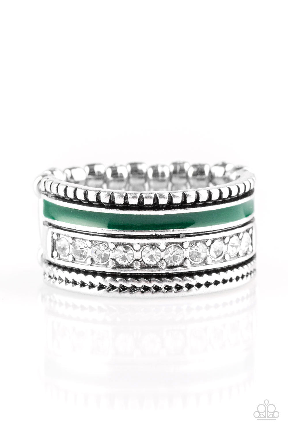 Tinted in the rich shade of Quetzal Green, a strip of color runs along the bottom of a row of glassy white rhinestones. Infused with silver textures, the mismatched details coalesce into one thick band across the finger. Features a stretchy band for a flexible fit.