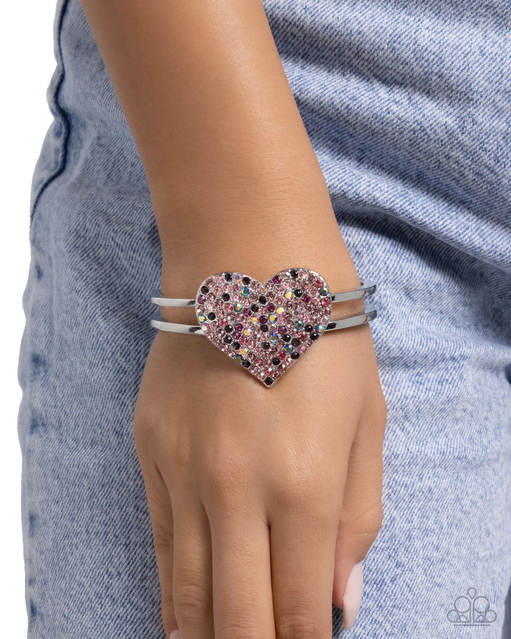 Encrusted in blinding pink multicolored and iridescent rhinestones, an oversized silver heart frame rests atop an airy, layered silver cuff, creating a flirtatious centerpiece. Features a hinged closure. Due to its prismatic palette, color may vary.