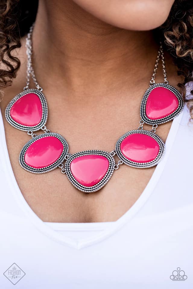 Featuring textured silver frames, asymmetrical oval and triangular pink beads dramatically link below the collar for a vibrant splash of color. Features an adjustable clasp closure.